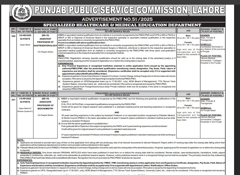The Punjab Public Service Commission has published PPSC Advertisement No 51/2025 in prominent newspapers on 31st December 2025. This provides several opportunities in Government Jobs in Punjab. The recruitment process targets major departments such as Specialized Healthcare and Medical Education Department; Board of Revenue (Provincial Disaster Management Authority – PDMA); and Punjab Food Authority.