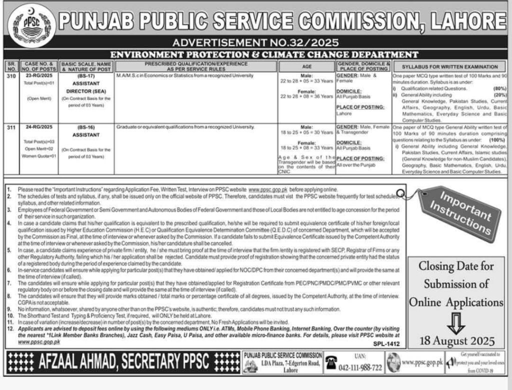 The result is that the Punjab Public Service Commission (PPSC) has now advertised its PPSC Jobs Advertisement No 32/2025 with various job openings under the Environment Protection & Climate Change Department. The positions of Assistant Director (SEA) and Assistant (BS-16) are also contractual jobs and can be applied to all of Punjab, given one meets the qualification criteria of the job.